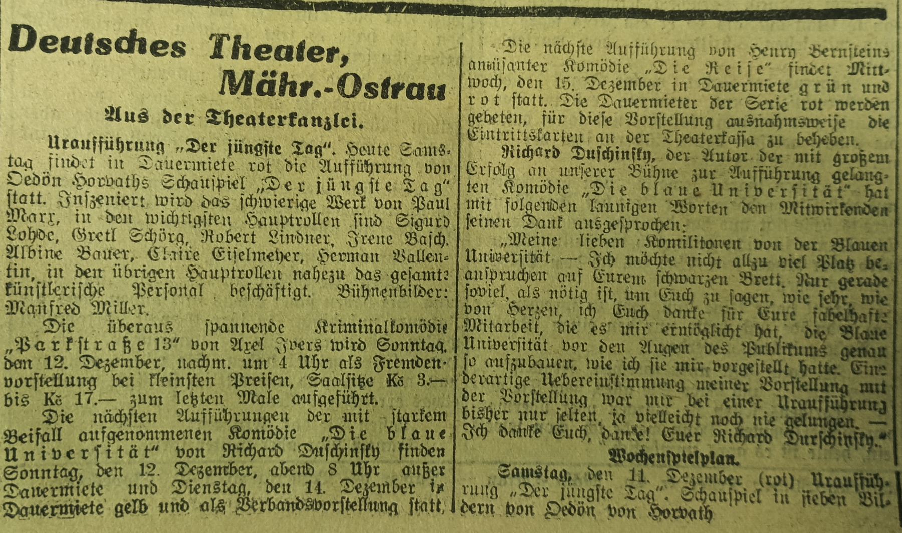 Upoutávka na premiéru hry Ödona von Horvátha Soudný den v německém deníku Ostrauer Zeitung z 11. 12. 1937