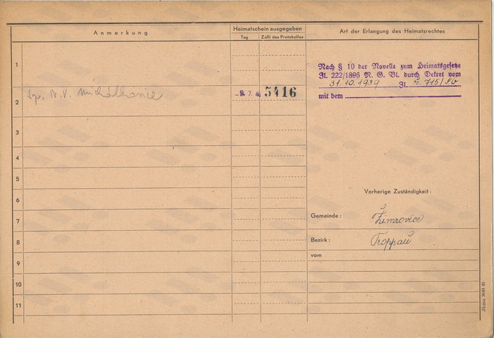 Josef Ladocha, domovská karta otce, rub. Zdroj: Archiv města Ostravy, Archiv města Moravská Ostrava, domovská kartotéka