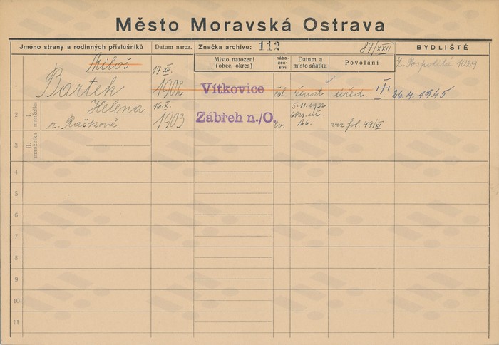 Miloš Bartek, domovská karta, rub. Zdroj: Archiv města Ostravy, Archiv města Moravská Ostrava, domovská kartotéka