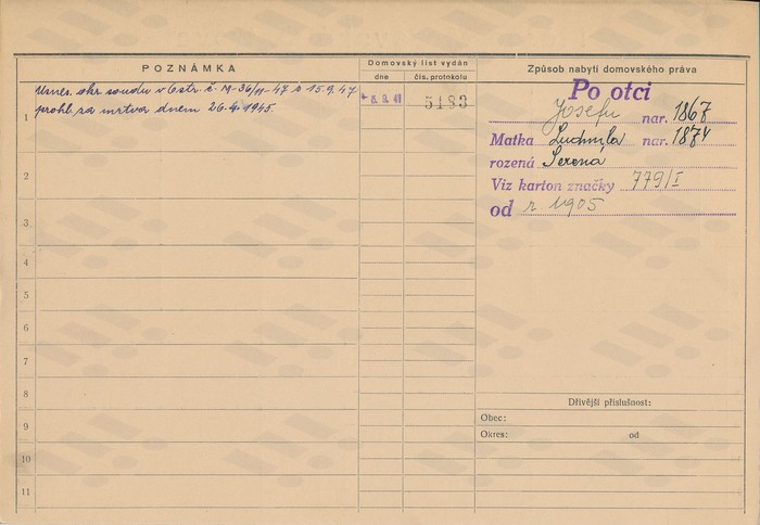 Josef Ladocha, domovská karta otce,... |