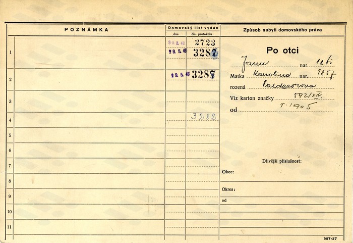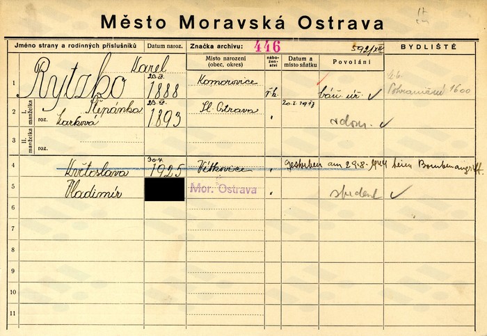 | Květoslava Rytzková, domovská karta... | Květoslava Rytzková, domovská karta... | Adolf Pietras, domovská karta otce,... |