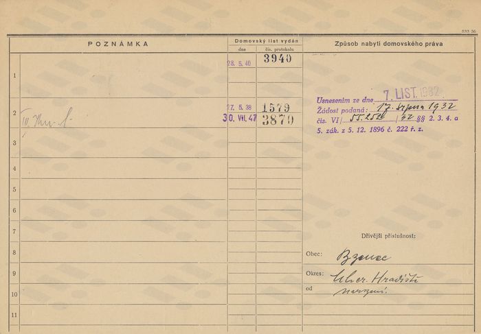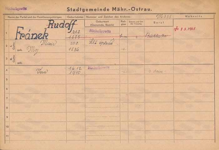 Karta domovské příslušnosti rodiny Rudolfa Fránka Zdroj: Archiv města Ostravy, fond Archiv města Moravská Ostrava, domovská kartotéka