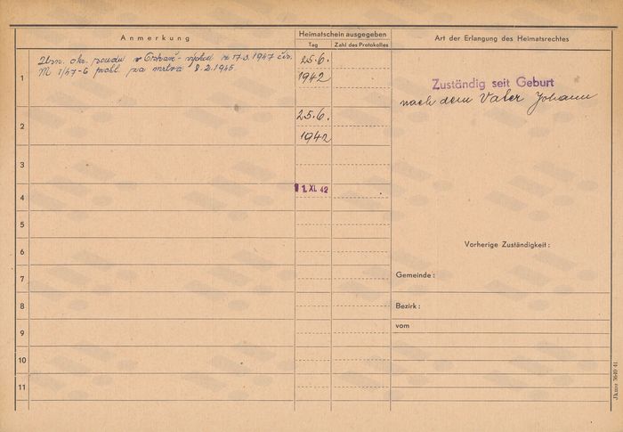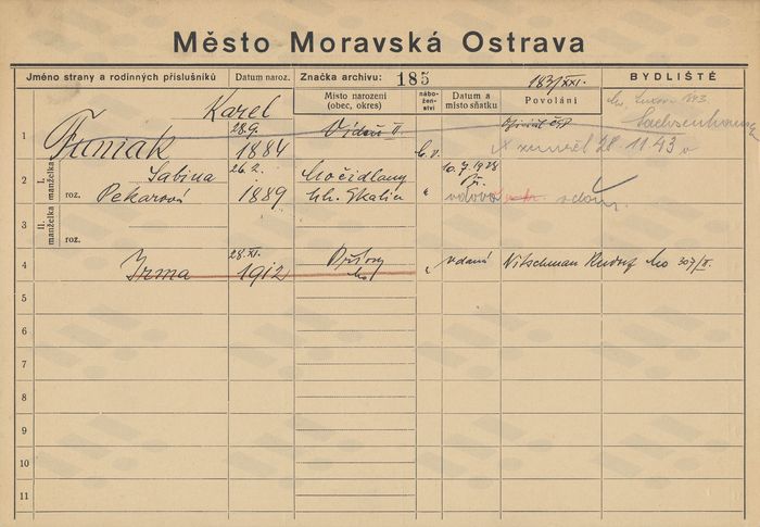 Karta domovské příslušnosti rodiny Karla Funiaka Zdroj: Archiv města Ostravy, fond Archiv města Moravská Ostrava, domovská kartotéka
