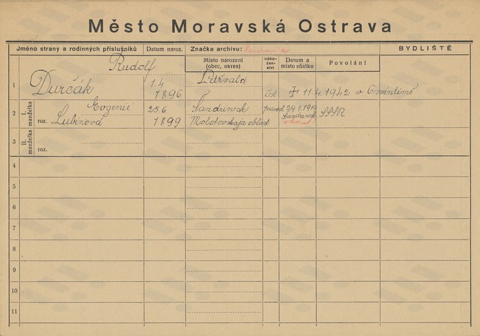 Rudolf Durčák, domovská karta. Zdroj: Archiv města Ostravy, Archiv města Moravská Ostrava, domovská kartotéka