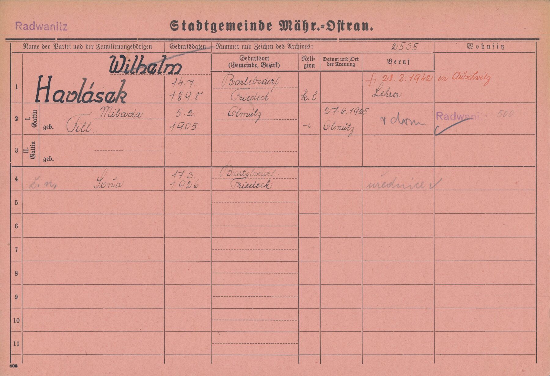 Archiv města Ostravy, domovská kartotéka - Vilém Havlásek