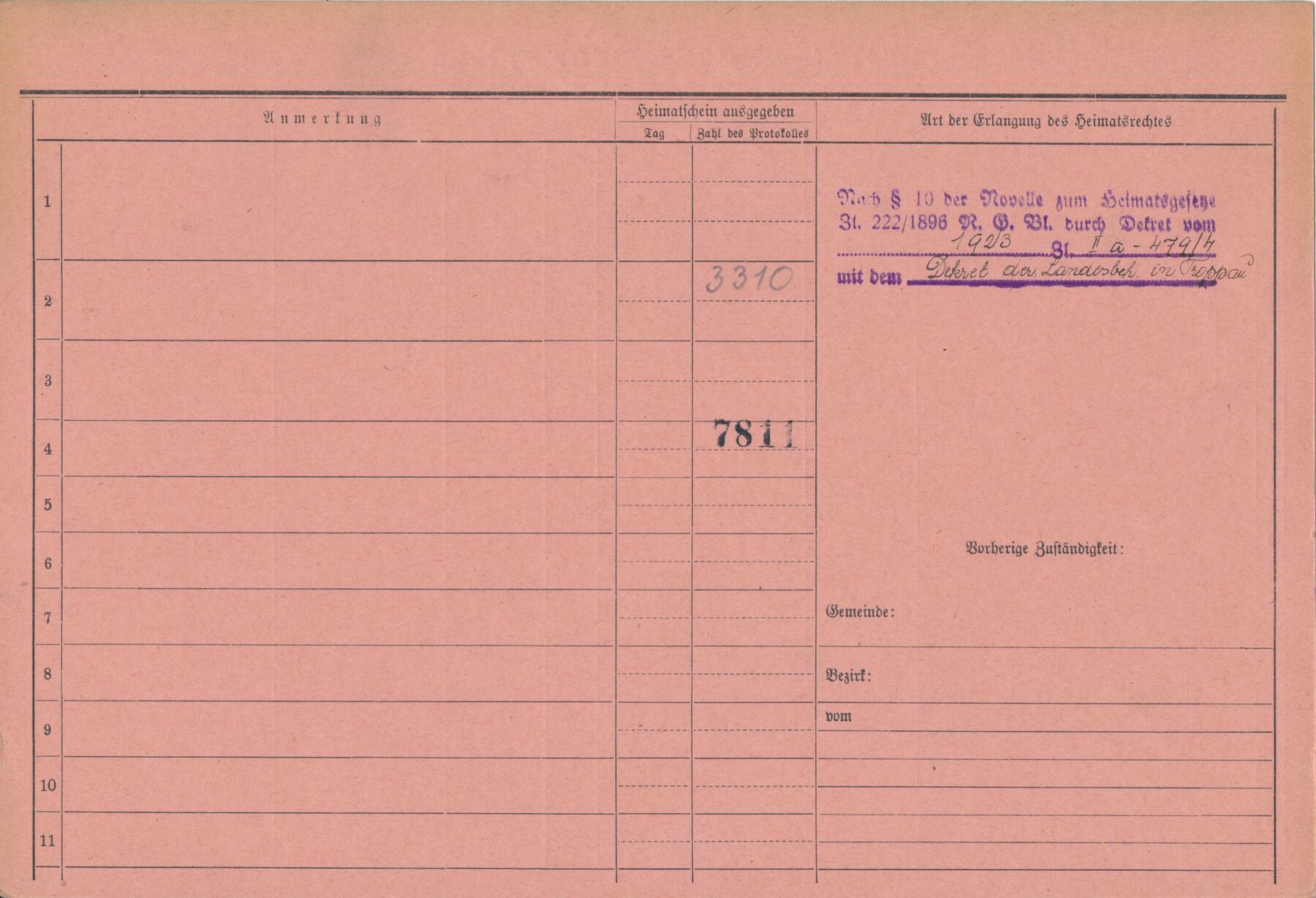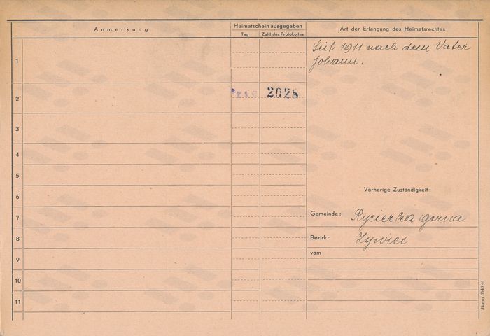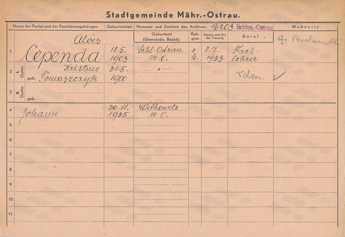 Alois Přibyl, domovská karta, rub. Zdroj: Archiv města Ostravy, Archiv města Moravská Ostrava, domovská kartotéka