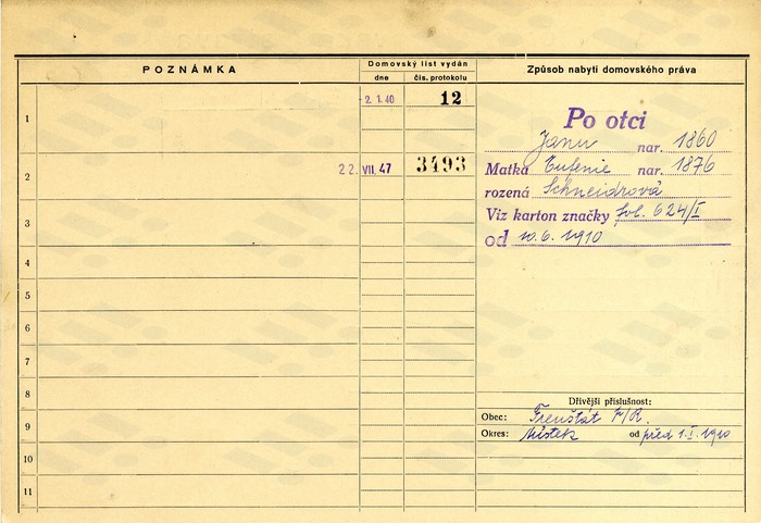 Josef Ladocha, domovská karta otce, rub. Zdroj: Archiv města Ostravy, Archiv města Moravská Ostrava, domovská kartotéka