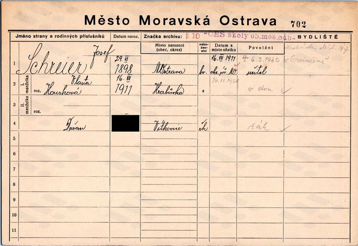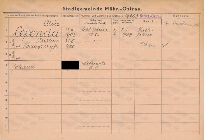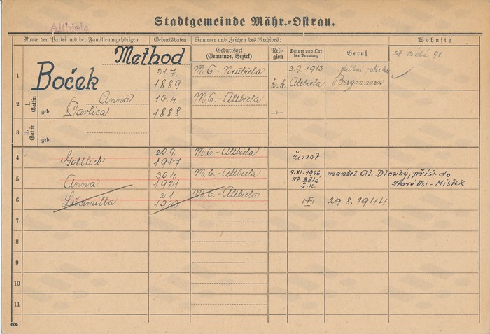 Ludmila Bočková, domovská karta otce. Zdroj: Archiv města Ostravy, Archiv města Moravská Ostrava, domovská kartotéka