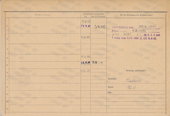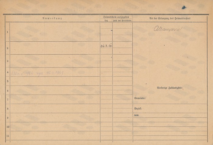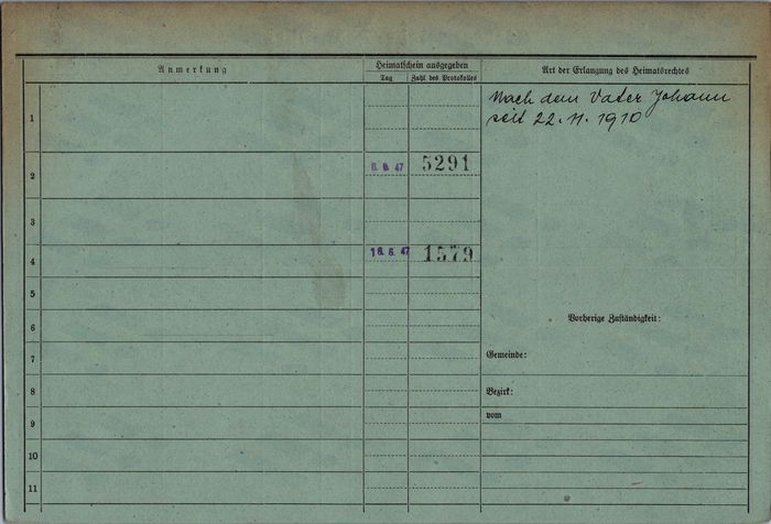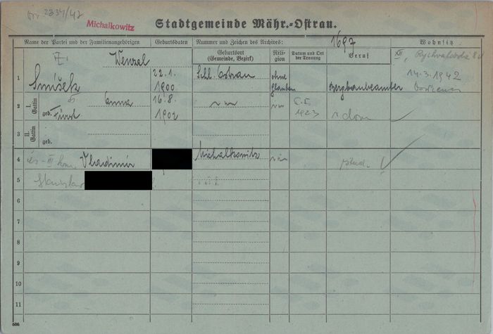 Ludmila Bočková, domovská karta otce, rub. Zdroj: Archiv města Ostravy, Archiv města Moravská Ostrava, domovská kartotéka