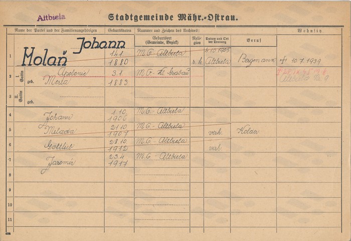 Jan Holaň, st., domovská karta. Zdroj: Archiv města Ostravy, Archiv města Moravská Ostrava, domovská kartotéka