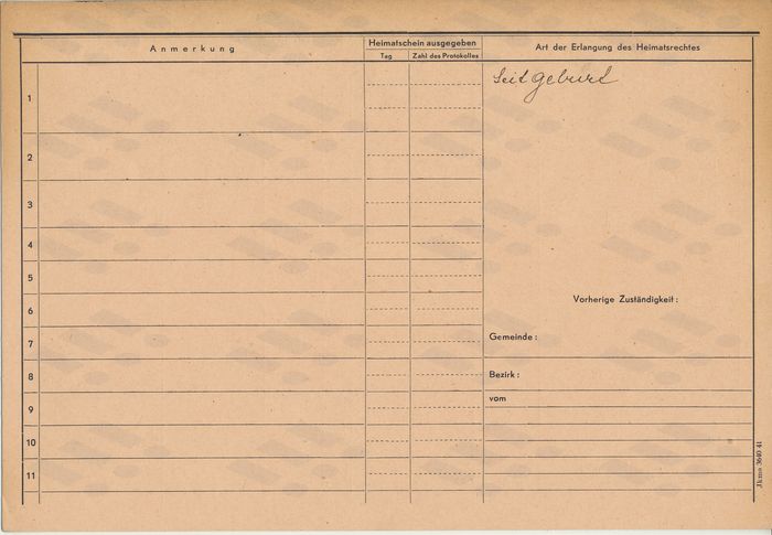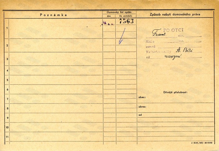 Rostislav Slavík, domovská karta, rub. Zdroj: Archiv města Ostravy, Archiv města Moravská Ostrava, domovská kartotéka