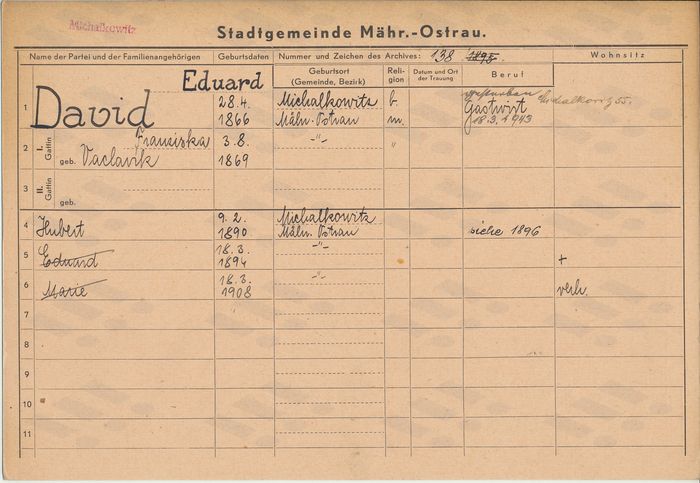 Archiv města Ostravy, Archiv města Moravská Ostrava. domovská karta Eduarda Davida