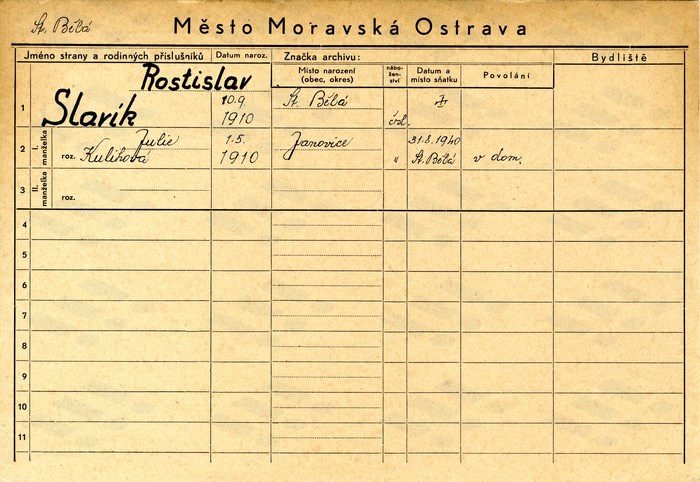 Rostislav Slavík, domovská karta. Zdroj: Archiv města Ostravy, Archiv města Moravská Ostrava, domovská kartotéka