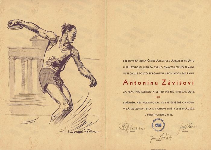 Diplom Přerovské župy České atletické amatérské unie A. Závišovi za práci pro lehkou atletiku (1943) Zdroj: Archiv města Ostravy, fond Záviš Antonín
