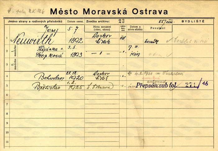 Bohuslav Neuvirt (Neuwirth), domovská karta otce. Zdroj: Archiv města Ostravy, Archiv města Moravská Ostrava, domovská kartotéka