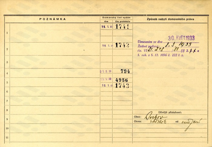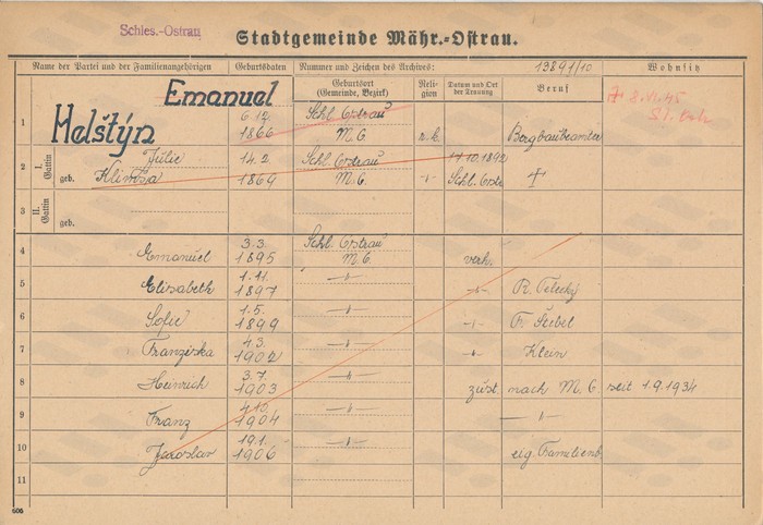 Eliška Telecká, domovská karta otce, rub. Zdroj: Archiv města Ostravy, Archiv města Moravská Ostrava, domovská kartotéka