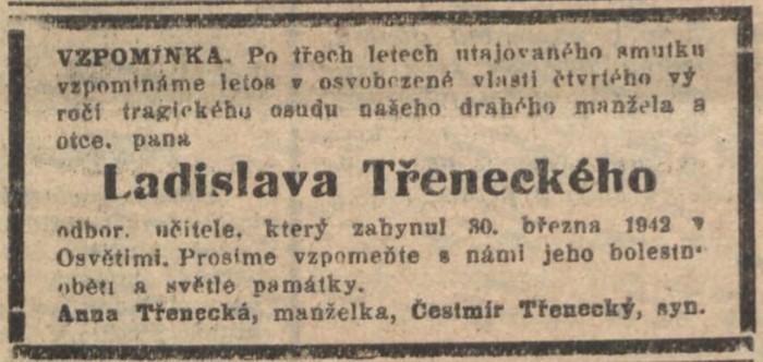 Vzpomínka na Ladislava Třeneckého, oznámení manželky a syna. Zdroj: Nová svoboda, 30. 3. 1946