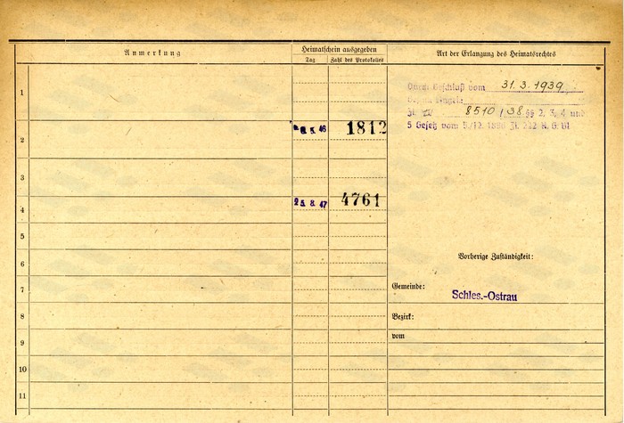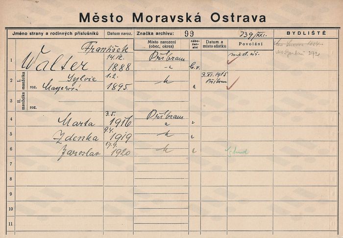 Karta domovské příslušnosti Sylvie Walterové Zdroj: Archiv města Ostravy, fond Archiv města Moravská Ostrava, domovská kartotéka
