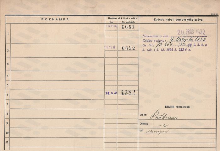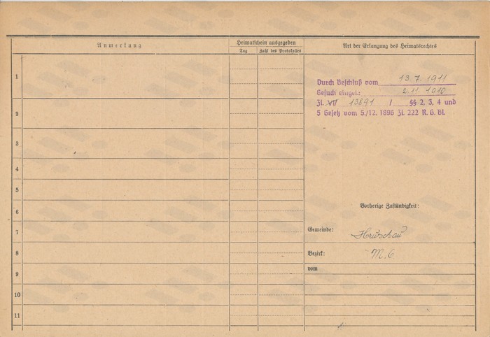 Bohuslav Neuvirt (Neuwirth), domovská karta otce, rub. Zdroj: Archiv města Ostravy, Archiv města Moravská Ostrava, domovská kartotéka