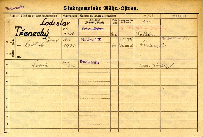 Ladislav Třenecký, domovská karta. Zdroj: Archiv města Ostravy, Archiv města Moravská Ostrava, domovská kartotéka
