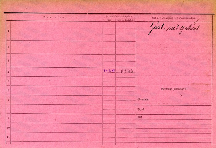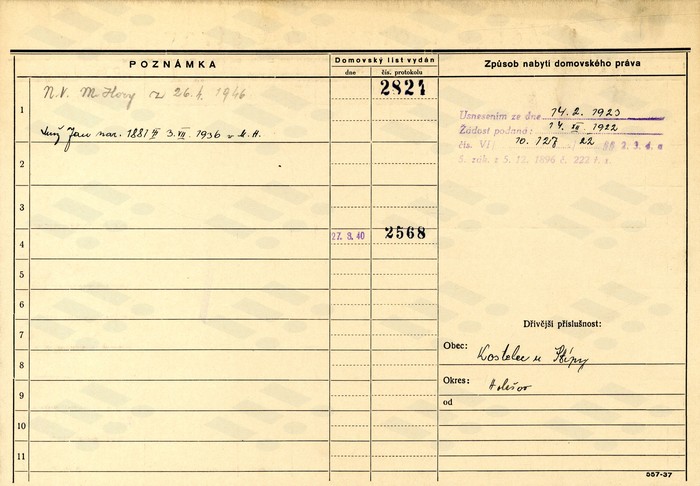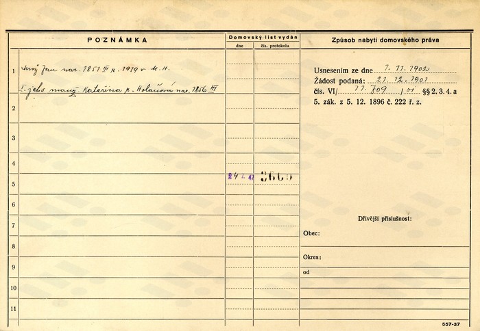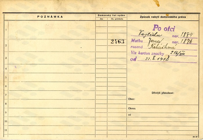 Marie Podešvová, domovská karta matky, rub. Zdroj: Archiv města Ostravy, Archiv města Moravská Ostrava, domovská kartotéka