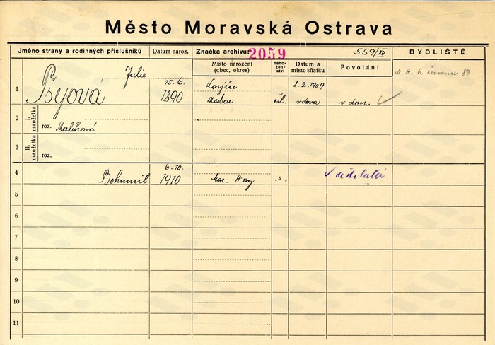 Bohumil Pšeja, domovská karta matky. Zdroj: Archiv města Ostravy, Archiv města Moravská Ostrava, domovská kartotéka