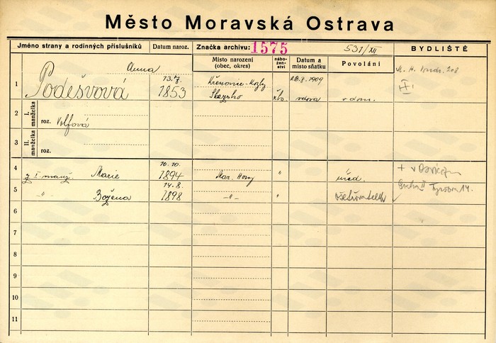 Marie Podešvová, domovská karta matky. Zdroj: Archiv města Ostravy, Archiv města Moravská Ostrava, domovská kartotéka