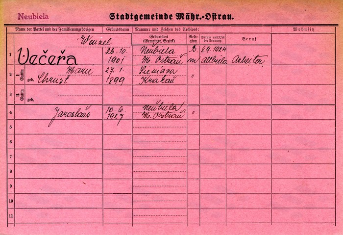 Jaroslav Večeřa, domovská karta otce. Zdroj: Archiv města Ostravy, Archiv města Moravská Ostrava, domovská kartotéka