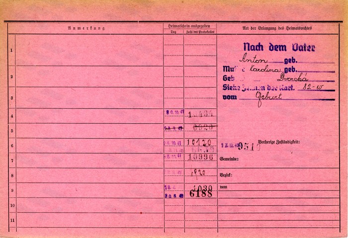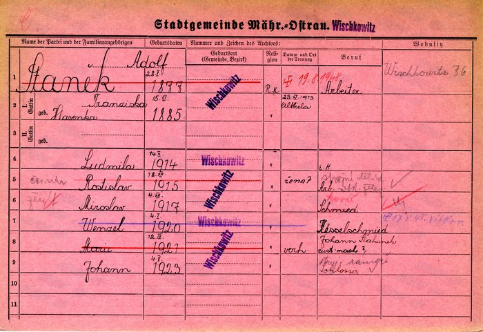 Václav Staněk, domovská karta otce, rub. Zdroj: Archiv města Ostravy, Archiv města Moravská Ostrava, domovská kartotéka