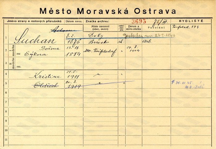 Oldřich Suchan, domovská karta otce. Zdroj: Archiv města Ostravy, Archiv města Moravská Ostrava, domovská kartotéka